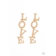 Gold letters with a lightly hammered sheen spell out the word "LOVE" as they vertically cascade down the ear in a flattering finish. Each of the letters are interconnected to one another giving the piece some whimsically playful movement. Earring attaches to a standard post fitting.