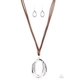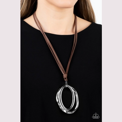 Long strips of brown leather knot around a silver link where a mismatched pair of smooth and hammered silver ovals swing from the bottom, resulting in a rustic pendant. Features an adjustable clasp closure.