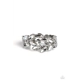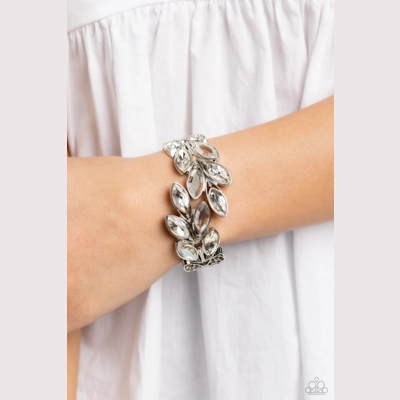 White and clear marquise-cut gems blossom from an array of silver marquise frames embossed in leafy filigree and tactile studs. Each frame interlocks around the wrist in a whimsical pattern to create a laurel-inspired design. Features a hinged closure.