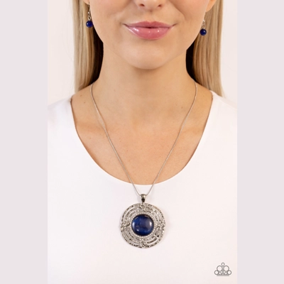 Rippling around an oversized navy cat's eye stone, hammered silver frames, with tilted silver accents, twist into three textured layers. A border of dainty white rhinestones dusts the navy cat's eye stone for a touch of glitz amongst the textured hoops. A dainty silver snake chain boosts the oversized labyrinth-styled pendant, further showcasing the exaggerated design. Features an adjustable clasp closure.
