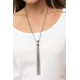 A metallic mashup of silver and gunmetal chains stream out from an oversized silver beaded fitting at the bottom of a chunky silver mesh chain, creating a tantalizing tassel down the chest. Features an adjustable clasp closure.