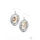 Flecks of iridescent shell shimmer against a background of white, creating an oblong oval centerpiece. Ripples of textured silver radiate from the shimmery focal point, encasing the design in asymmetrical frames. Earring attaches to a standard fishhook fitting.