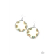 Green and orange seed beads are threaded on wires and looped over turquoise stones on the inside of a spacious silver hoop. The pattern makes its way around the inside of the circle for an around-the-world air. Earring attaches to a standard fishhook fitting.