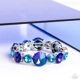 Pressed in silver-pronged frames, vibrant blue gems in varying sizes and shades alternate along stretchy bands around the wrist, creating a colorful pop of color. The larger blue gems feature a stellar UV shimmer for additional eye catching shimmer.