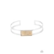 A bold shell-like acrylic accent is encased in a shiny silver rectangular frame which sits resolutely atop a double-bar silver cuff. Color and pattern may vary.