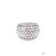 A thick band of silver arcs across the top of the finger, creating an exaggerated rounded frame. Countless tiny white rhinestones scatter across the surface, as straight lines of even more rhinestones line the outer edges in a blinding finish. Features a stretchy band for a flexible fit.