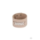 Two rows of oversized white rhinestones are studded in place across the center of a thick leather band, creating a sassy centerpiece around the wrist. Features an adjustable snap closure.