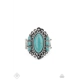 Dotted with an oval turquoise stone center, the sides of a scalloped silver frame are adorned in square and triangular cut turquoise stones. The antiqued frame is dotted in shiny silver studs, adding a rustic edge to the artisan inspired centerpiece. Features a stretchy band for a flexible fit.