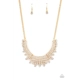 Shimmery strands of multi-sized white rhinestones majestically morph into gold framed layers along the collar for a sparkling statement piece. Features an adjustable clasp closure.