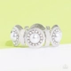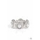 Concaved silver frames, with an embossed row of white gems, encircle an oversized pearl center creating refined flowers. Sleek curls of silver alternate between the bejeweled flowers for additional shine and capricious shimmer along the wrist on stretchy bands.
