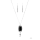 Encased in a sleek silver frame, an oversized black gem swings from the bottom of a classic silver chain. A lobster clasp hangs from the bottom of the design to allow a name badge or other item to be attached. Features an adjustable clasp closure.